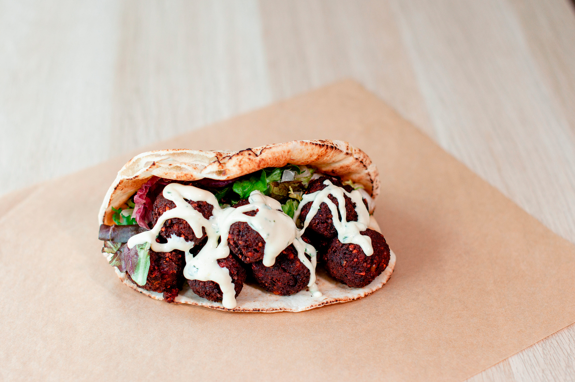 - Pita de Falafel de Garbanzo y Remolacha con tabule, aderezado con salsa de ajo y chermula (vegetariano y opción vegana)