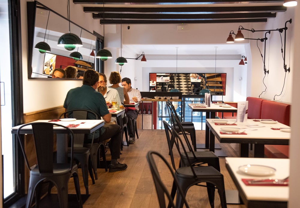 Este local es un espacio más abierto, con las cornisas desnudas pintadas de negro y pareces blanca. Claro predominio de elementos industriales. El rojo y la luz amarilla aportan un guiño a las banderas autóctonas, lo que es un mensaje de tradición.