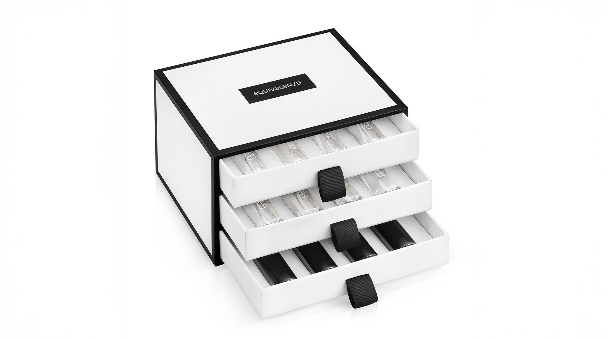 Este elegante cofre tipo joyero está formado por tres cajones con 12 viales de perfumes de 12 ml. En los dos primeros se encuentran ocho fragancias regulares best sellers de Equivalenza, y en el tercer cajón se incluyen cuatro viales de la colección Les Secrets, la línea más premium de la marca.